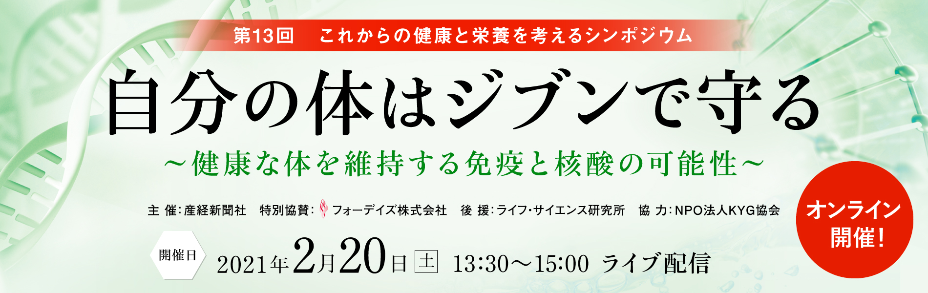 第13回これからの健康と栄養を考えるシンポジウム「自分の体はジブンで守る~健康な体を維持する免疫と核酸の可能性~」のライブ配信へのお申込み期間は終了致しました。